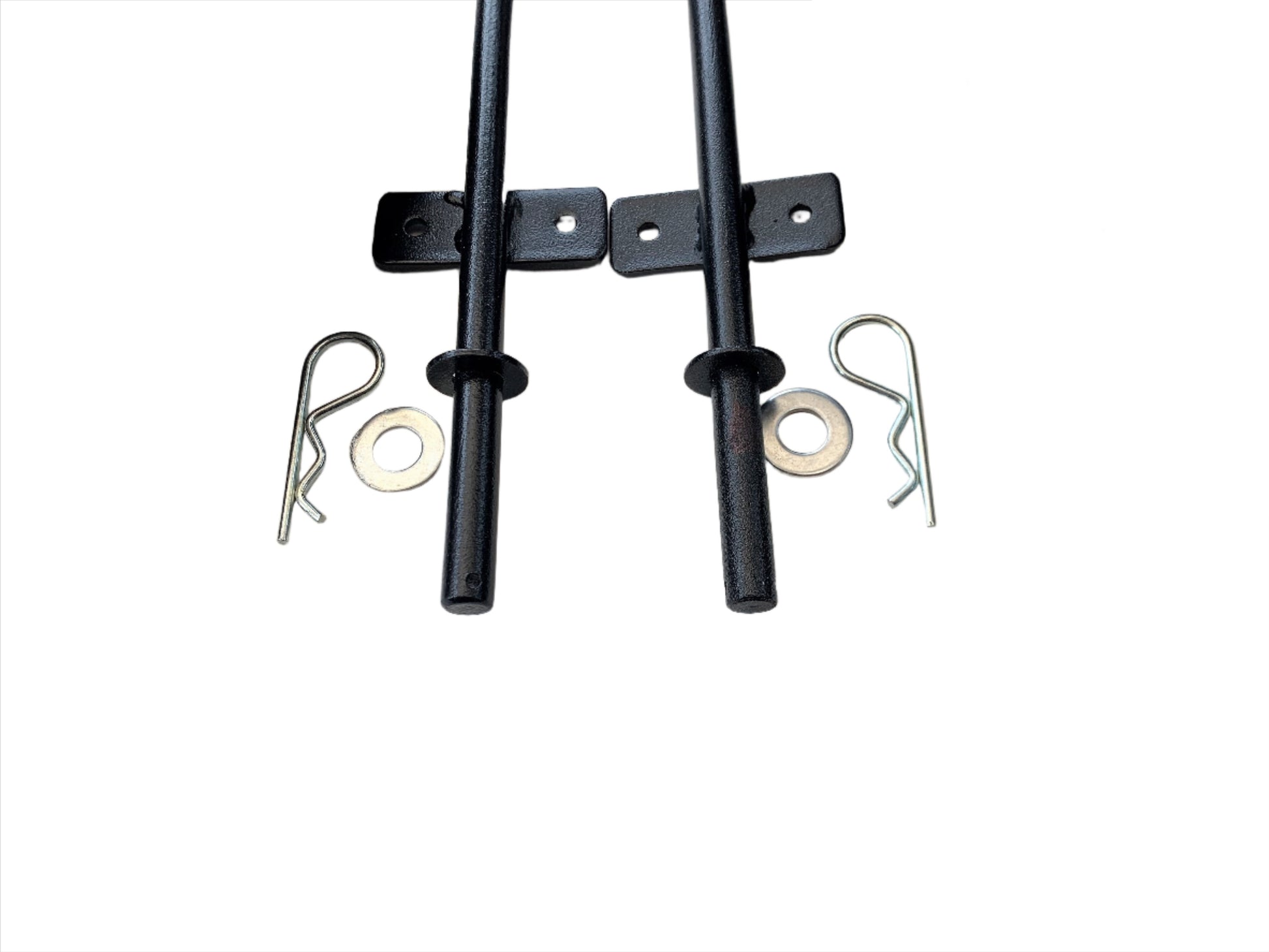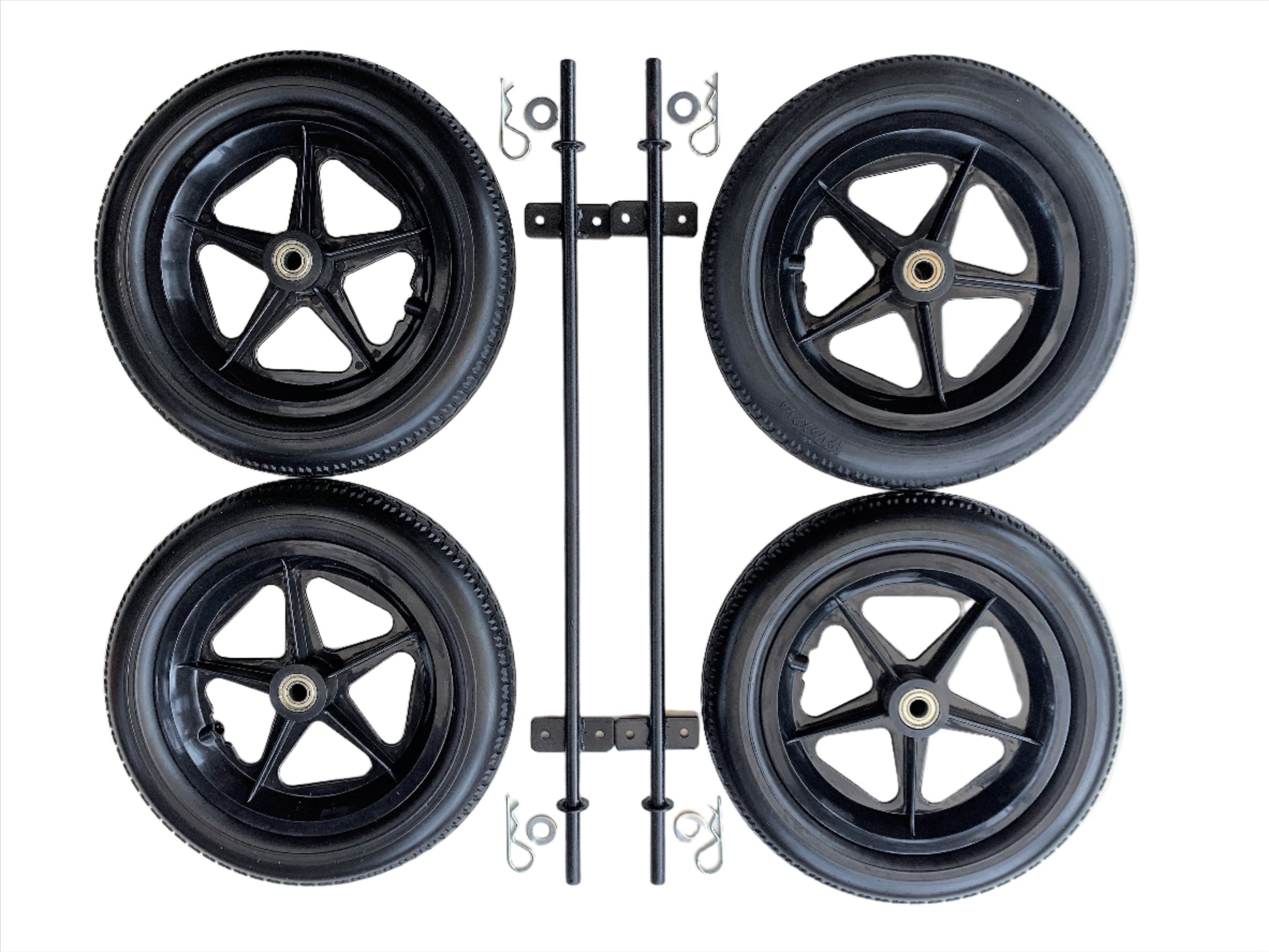 Strong lightweight five spoke plastic black rims. 2 x 600mm or 500mm x 12mm black powered coated axles with fixing brackets. R clips & washers for retaining wheels included. 470mm or 370mm space between wheels. Max weight 107 kg