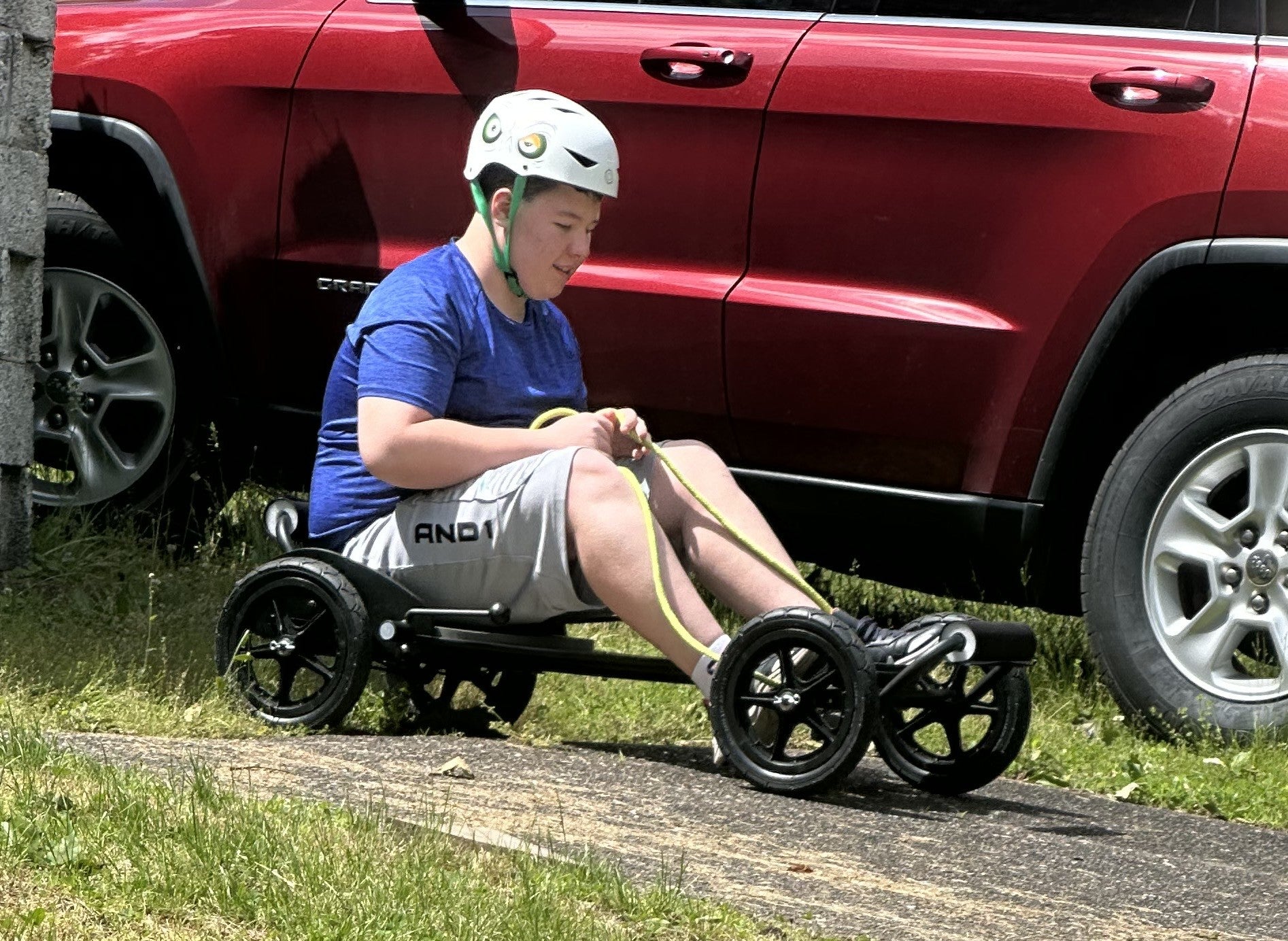 It ended up just right, my grand-son phoned me last night, I had it delivered yesterday, he said it was really quick. He had a pair of his Dad’s overalls on, and his bicycle helmet, he said he felt like a Formula 1 driver.