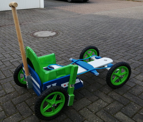 I used a "grown out of" (well known Swedish furniture stores) children's high chair for a seat and painted in his favorite colours, added a removable push handle at the back.