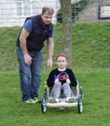 I though you might be interested in the cartie I made, using your wheels and brake, for my daughter. I had always promised to make her one, but never alas got round to it. That is until four weeks ago when I presented her with it on her wedding day – only 20 years too late! she seemed very pleased with it.